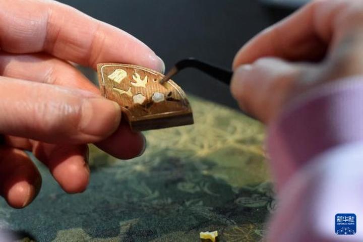 4月9日,游客在圆明园博物馆体验踏青节主题非遗手作活动之一的螺钿镶嵌技艺。