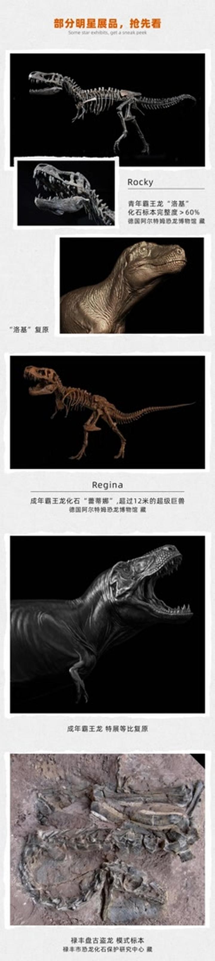 两件霸王龙骨骼化石来自德国阿尔特姆恐龙博物馆:青年霸王龙Rocky(洛基)化石标本,完整度超过60%,这一完整度在霸王龙化石中极为罕见;成年霸王龙化石Regina(蕾蒂娜)是超过12米的超级巨兽。包括霸王龙化石在内,展览将展出百余件珍贵展品,真化石占比超85%。中国龙、永川龙、异特龙、鲨齿龙……威名赫赫的大型肉食性恐龙齐聚一堂,各路史前强悍猎手各展锋芒。众多1:1等比例科学复原的模型更是让观众大饱眼福。