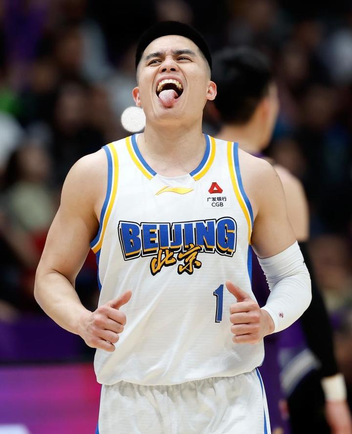 4月10日,北京北汽队球员陈盈骏在比赛中庆祝得分。