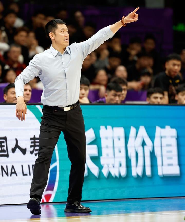 4月10日,北京控股队主教练张庆鹏在场边指挥。