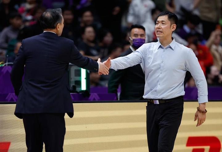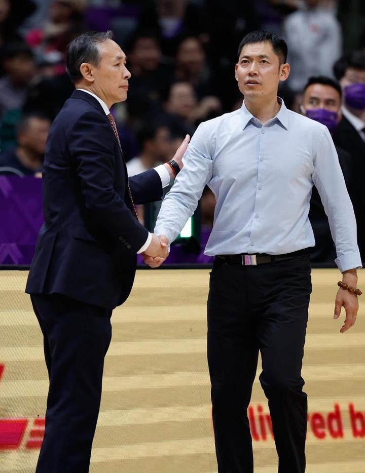 4月10日,北京控股队主教练张庆鹏(右)在比赛尾声与北京北汽队主教练许利民相互致意。