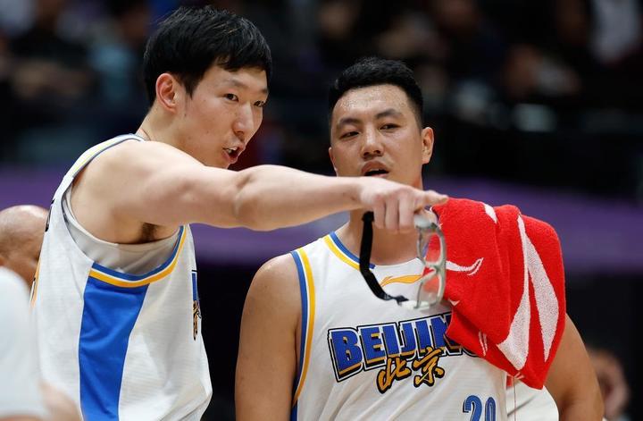 4月10日,北京北汽队球员周琦(左)与队友翟晓川在比赛间隙交流。
