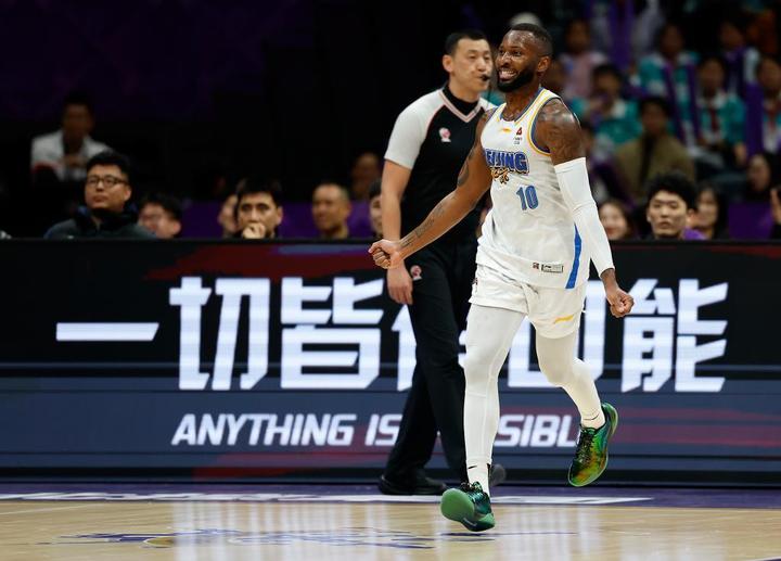 4月10日,北京北汽队球员尤金-杰曼在比赛中庆祝得分。