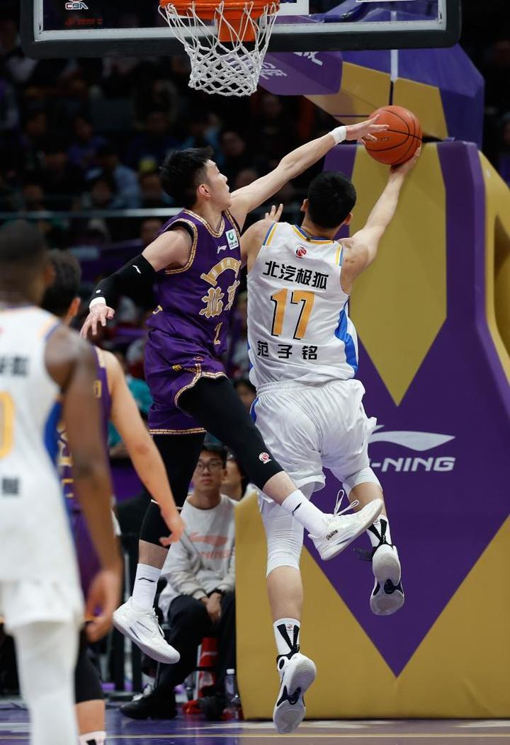 4月10日,北京控股队球员廖三宁(上左)在比赛中防守北京北汽队球员范子铭。