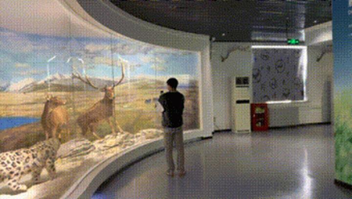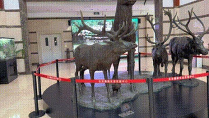 麋鹿苑科普楼内游客打卡拍照。白洛凡/摄