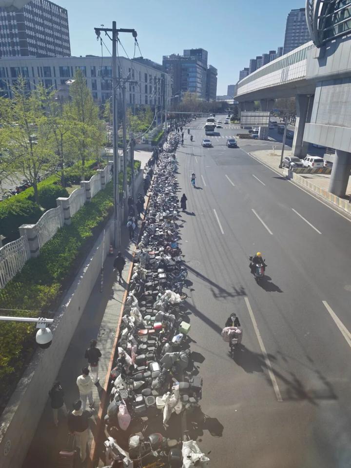 4月7日早高峰时段,北京晚报记者在立水桥南站C口看到,从地铁口向南北延伸、长约二百米的非机动车道被各类非机动车塞得水泄不通。非机动车道里侧,一排排私人电动自行车和自行车垂直路沿停了一整排;一辆挨一辆实在放不下,又斜着往外摆出第二排;最终连第二排也挤不下,车头、车尾便探进了机动车道。