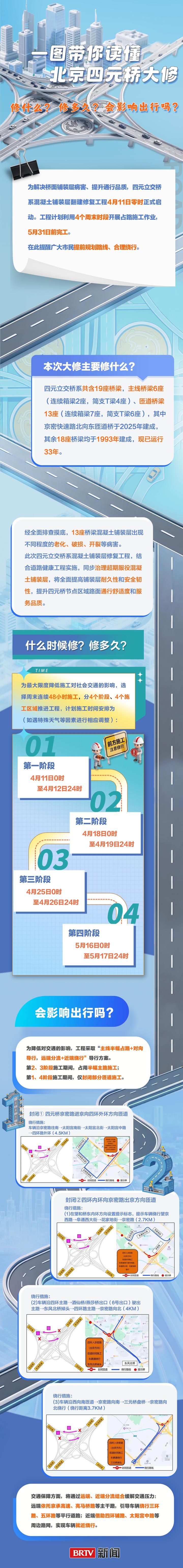 今天(4月11日)凌晨,北京市四元立交桥系混凝土铺装层翻建修复工程启动。四元桥是北京四环路与机场高速、京密快速路交会的关键交通枢纽,此次大修主要是为解决桥面铺装层病害、提升通行品质。工程计划利用4个周末时段开展占路施工作业,5月31日前完工。本周末48小时内,作为四环桥系修复“手术”的第一阶段工程,两条匝道桥将完成翻新。