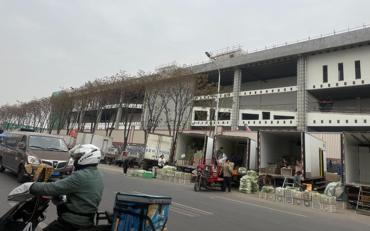 新发地蔬菜交易大楼(B座)正在进行外立面装修,预计今年6月底完工。新京报记者 陈琳 摄