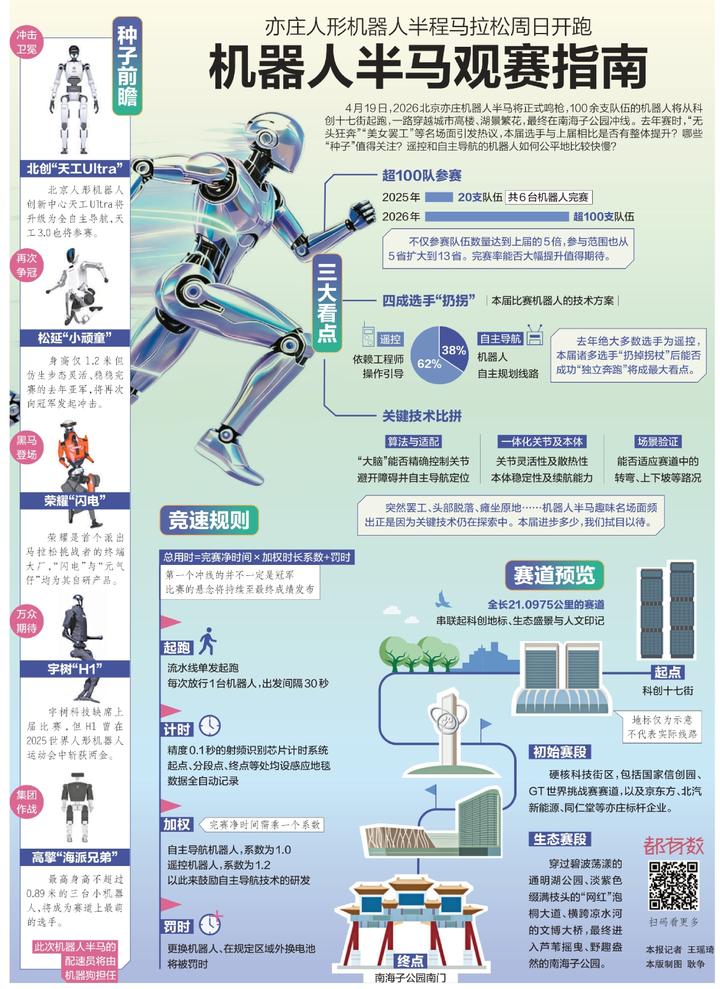 +订阅4月19日,2026北京亦庄机器人半马将正式鸣枪,100余支队伍的机器人将从科创十七街起跑,一路穿越城市高楼、湖景繁花,最终在南海子公园冲线。去年赛时,“无头狂奔”“美女罢工”等名场面引发热议,本届选手与上届相比是否有整体提升?哪些“种子”值得关注?遥控和自主导航的机器人如何公平地比较快慢?