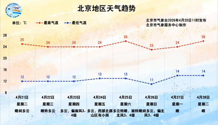 本周北京大部时间天气晴到多云,最高气温维持在23℃~26℃之间,午后暖意融融,大部分时段体感舒适,非常适合踏青赏花、感受暮春气息。
