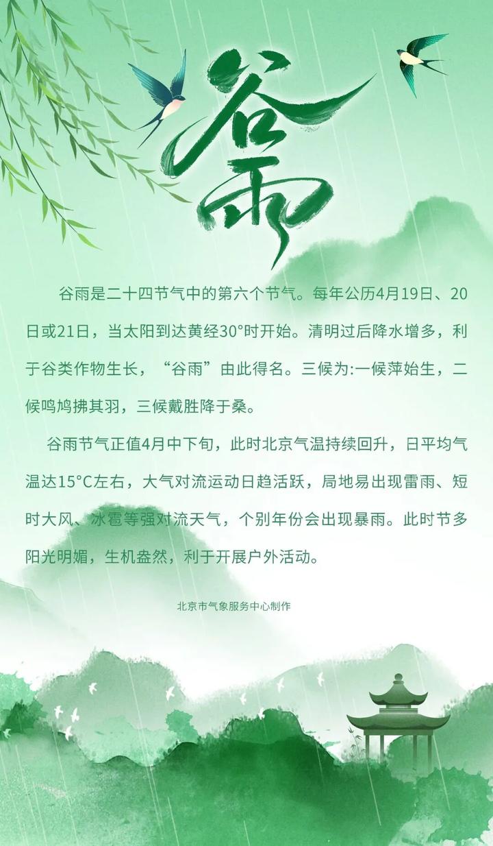 今日迎来谷雨,也是春季最后一个节气,京城天气晴好舒适。白天最高气温在22℃上下,春意正浓。中午到傍晚风力有所加大,阵风6级左右,外出请注意做好防风措施,远离广告牌、围挡等临时搭建物,警惕高空坠物,注意出行安全。