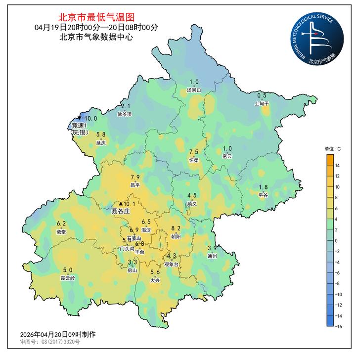 4月19日20时至20日08时,观象台最低气温4.3℃(05:38)。