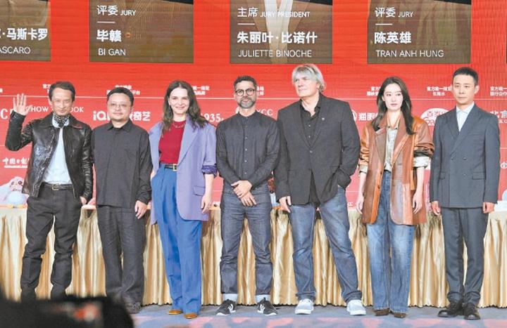图为“天坛奖”评委团成员朱丽叶·比诺什、毕赣、陈英雄、加布里埃尔·马斯卡罗、西蒙·弗兰格伦、张小斐、张译与媒体见面。本报记者 和冠欣摄