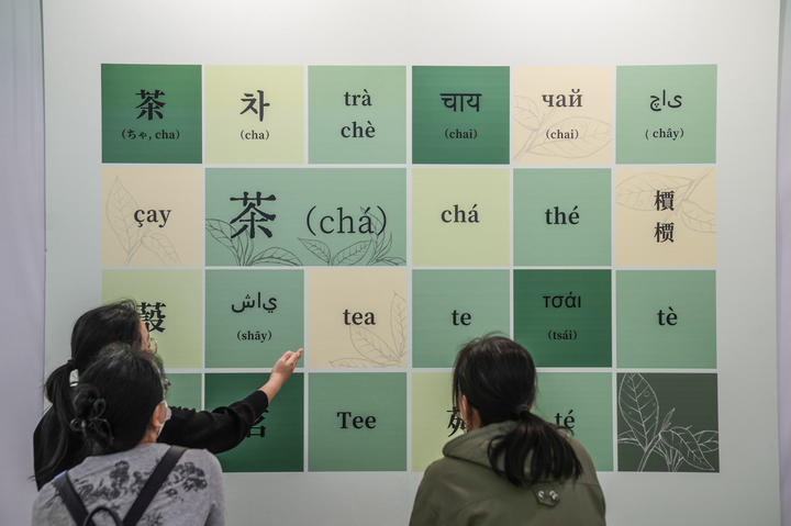 图为参观者在了解各国语言里的“茶”。