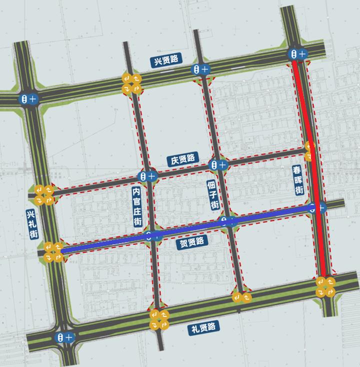 据了解,两条道路均位于临空区大兴片区礼贤片区,规划为城市次干路,建设内容涵盖道路、交通、绿化、照明及各类市政管网工程。其中,春晖街设计速度为50公里/小时,道路红线宽度40米,项目南起大礼路边沟北侧,北至兴贤路,道路全长约550米。贺贤路设计速度为30公里/小时,道路红线宽度30米,项目西起兴礼街,东至春晖街,道路全长约705米,建成后将与春晖街形成路网衔接,畅通区域交通循环。