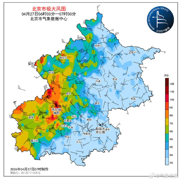 现在城区西部风力已加大,偏北风4级左右,城区极大风速值出现在丰台区千灵山,22.7米/秒(9级)。