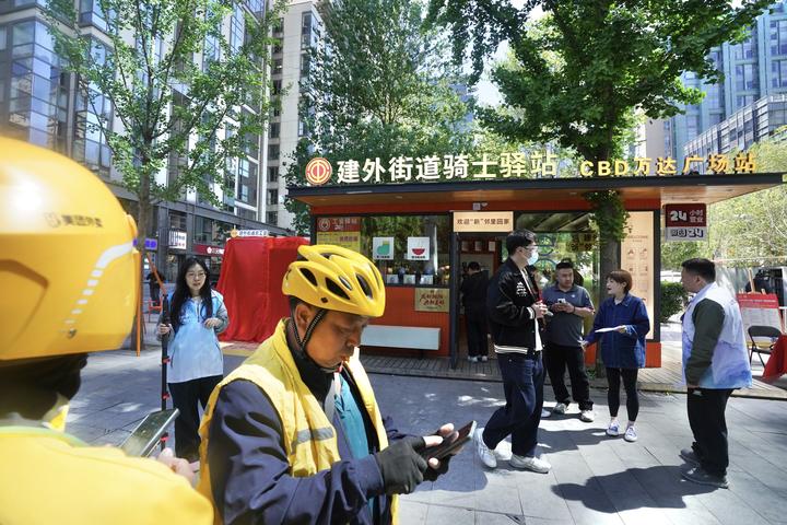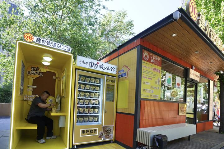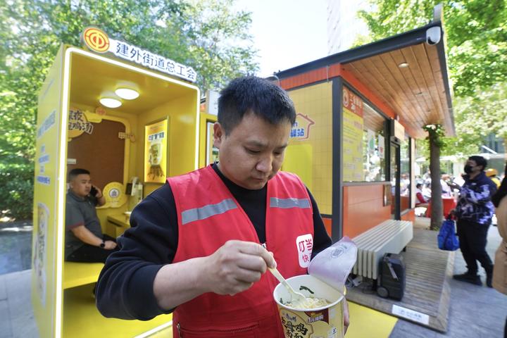 建外街道坐落于CBD核心地带,辖区内商务楼宇密集,在这里活跃的快递外卖员、网约车司机等新就业群体超1000人。“我们走访发现,很多骑手、网约车司机深夜跑单时,常常只能啃面包,想找个地方歇脚、充电都不容易。”建外街道相关负责人在采访中表示,街道积极联动爱心企业,打造了“1㎡暖心面馆”。