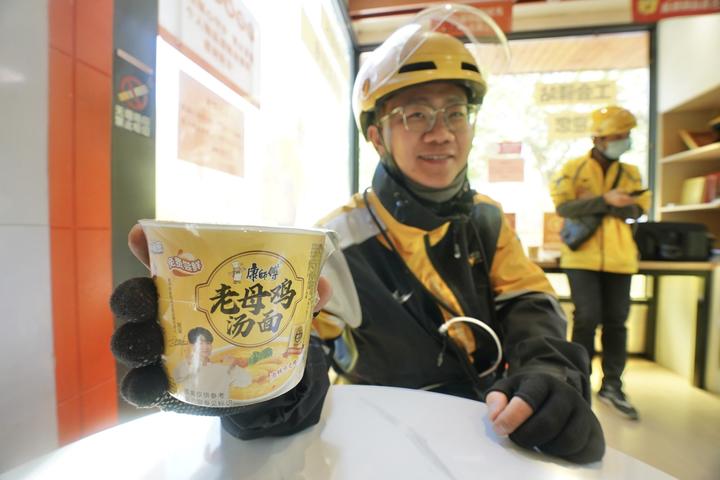 暖黄色主色调搭配柔和灯光,营造出归属感。“在外面跑了一天,大半夜能吃上一口免费的方便面,心里特别暖。”揭牌仪式现场,一位外卖小哥捧着热气腾腾的康师傅老母鸡汤面,脸上露出笑容。