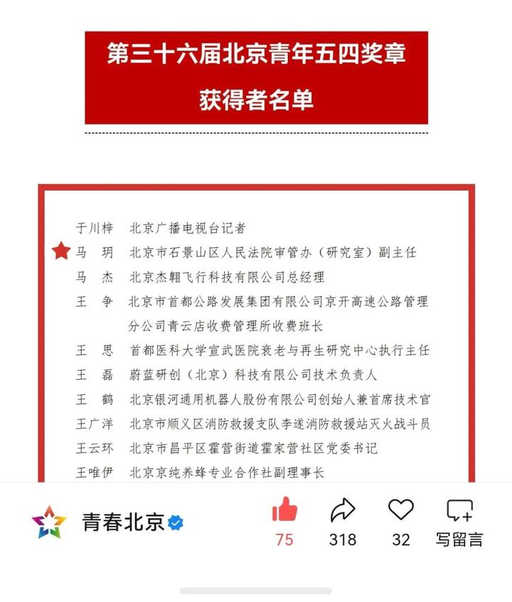 原标题:《喜报!石景山法院马玥同志荣获第三十六届“北京青年五四奖章”》
