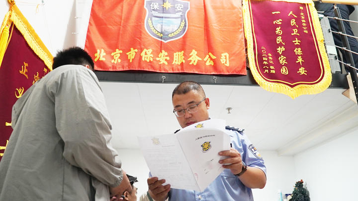 在丰台招聘点,警方现场查获伪造的“北京市保安服务有限公司印章”1枚、合同300余份。记者注意到,该窝点藏在一商用性质的公寓楼内,内部空间不大,但布置极具欺骗性,不仅摆放着“经理工牌”,墙上还悬挂着“忠于职守 正义卫士”等字样的锦旗。在大兴、房山、昌平、通州区4处人员安置点,警方还终止了非法合同项目3个。