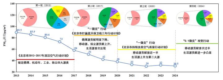 2013-2024年北京市PM2.5来源解析结果及不同阶段政策措施情况。北京市生态环境局供图