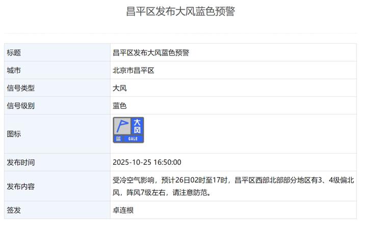 10月25日16:50,昌平区发布大风蓝色预警:受冷空气影响,预计26日02时至17时,昌平区西部北部部分地区有3、4级偏北风,阵风7级左右,请注意防范。