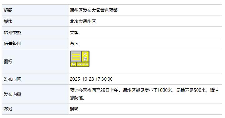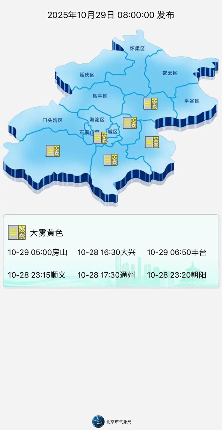 大兴区、通州区、朝阳区、顺义区、房山区、丰台区目前处于大雾黄色预警信号中,今天早晨能见度和大气扩散条件明显较差,有轻雾或雾,南部、东部部分地区能见度不足1公里,局地不足500米,早高峰注意交通安全。10月29日后半夜至30日上午有3级左右偏北风,能见度好转。
