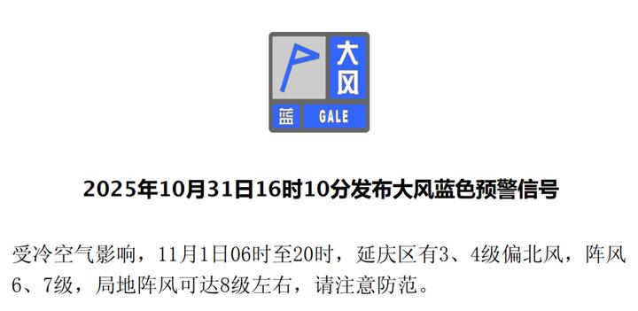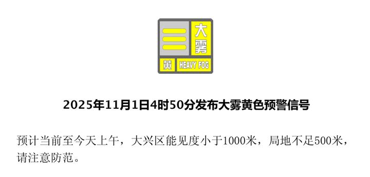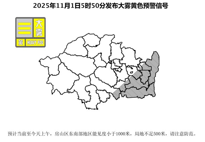 今早,气象北京分区发布大雾黄色预警。其中,房山区、大兴区大雾黄色预警中。延庆区大风蓝色预警中。注意防范