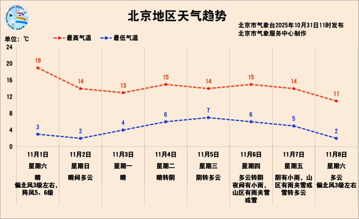 周末两天以晴为主,适宜户外活动。周六气温回升,北风明显,注意防风;周日气温再降,注意调整着装。新的一周,6日夜间到7日白天有弱降雨,山区有雨夹雪或雪,请注意防范并关注临近预报。白天最高气温在11~19℃之间,夜间最低气温在2~7℃之间。气温有一定起伏,大家及时调整着装,谨防着凉感冒。