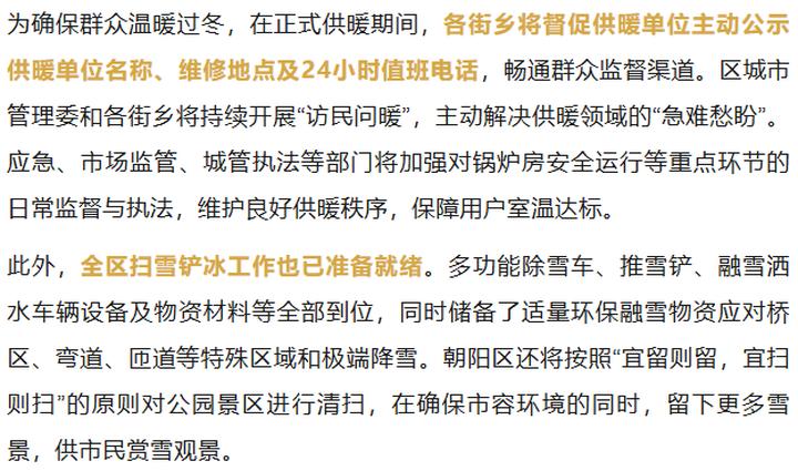 +订阅据“北京朝阳”微信公众号消息,日前,根据朝阳区2025—2026年度冬季供热暨扫雪铲冰工作动员部署会安排,朝阳区供热单位目前已具备供热条件,若无异常天气情况,各供热单位将按计划于11月7日统一启动点火试运行。