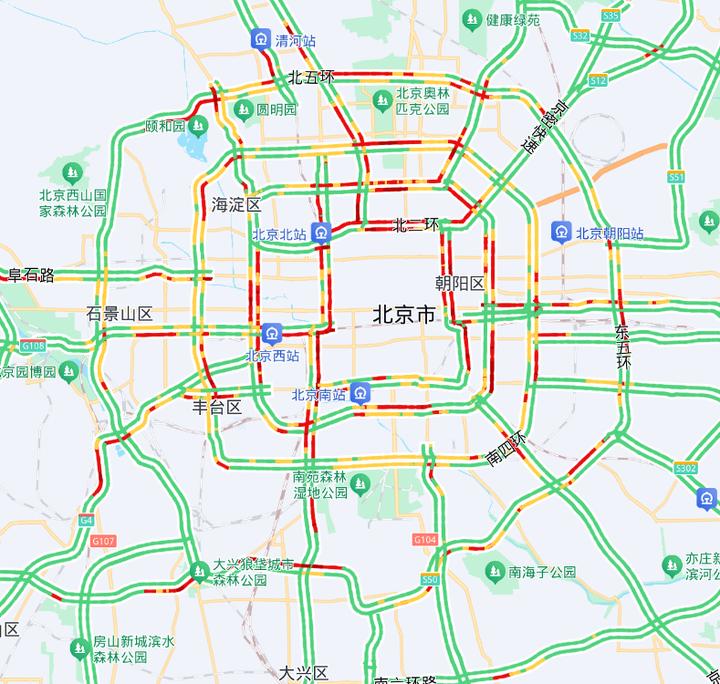 早高峰期间,城区主要环路部分路段,莲石东路、菜户营南路、西直门北大街等联络线进城方向,京藏、京开、京承、京港澳、京通快速路等高速公路进京方向部分路段车流量大。