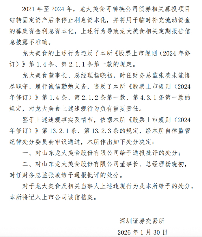 1月30日,深圳证券交易所(下称“深交所”)发出多份监管函,对山东龙大美食股份有限公司(002726.SZ,下称“龙大美食”)及相关责任人给予通报批评。