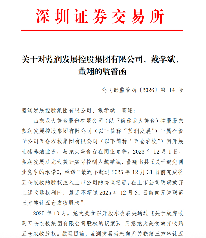 在主业造血能力衰退之外,公司治理层面的同业竞争问题也悬而未决。深交所在监管函中指出,公司控股股东蓝润发展控股集团有限公司(下称“蓝润发展”)旗下全资子公司五仓农牧集团有限公司从事生猪养殖,与上市公司构成同业竞争。