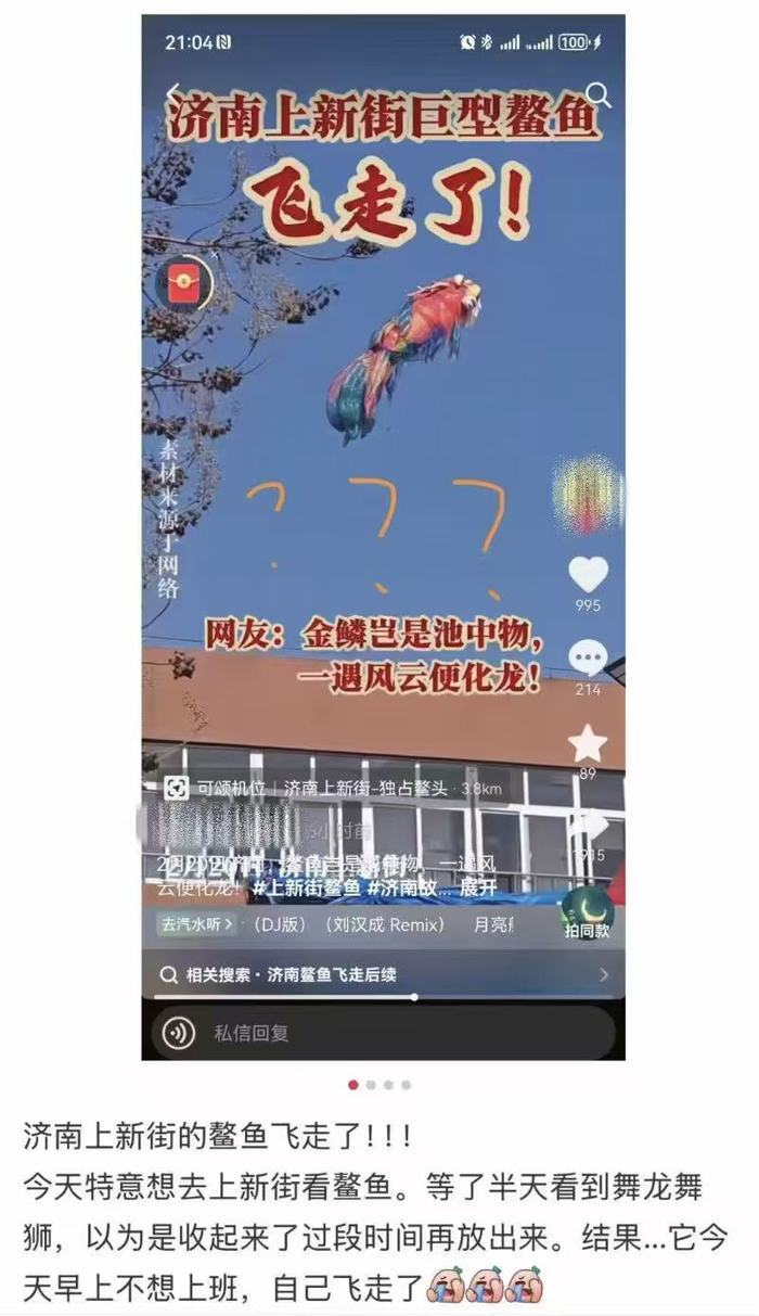 这个春节,济南的老街巷上新街,因为一个戏剧性的意外,牵动了一座城的心:一只大型鳌鱼气球装置因突发大风脱离原有悬挂位置“飞天而去”,它的“飞天”让无数泉城市民在朋友圈里接力寻找,更引发了关于“一飞冲天”“独占鳌头”的热烈讨论。如今,在元宵佳节之际,这只承载着全城记忆与美好寓意的鳌鱼,以一种更震撼、更有温度的方式,“飞”回了上新街的上空。