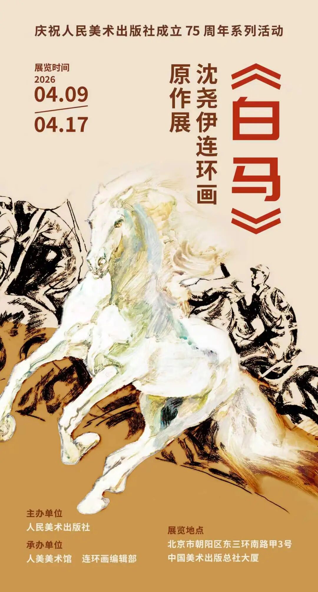 值此人民美术出版社成立75周年之际,为回望出版初心、致敬奋进时代,《白马》沈尧伊连环画原作展将于2026年4月9日在人美美术馆正式启幕,展览由人民美术出版社主办,人美美术馆、连环画编辑部承办。此次展览将展出120幅《白马》连环画原稿,让广大观众近距离感受原作的细节、画面张力与艺术魅力,沉浸式体验红色经典的创作温度。