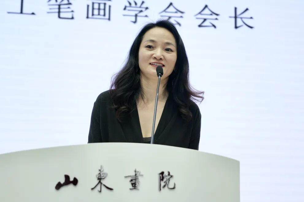 罗寒蕾介绍了广东省工笔画学会在三月份举办了“生而有灵”的第一次展览,计划每年推出十位不同艺术家,通过十年的累积持续延续艺术交流活力。此次,广东省工笔画学会怀着学习取经的热忱来到美术强省山东,在山东画院开展交流活动,走进画家画室深入交流,通过此次活动感受到了深厚的艺术文化底蕴,汲取了继续前进的深刻动力。她在发言中感谢了山东画院的支持、幕后人员的辛勤付出,以及每一位观众的关注。