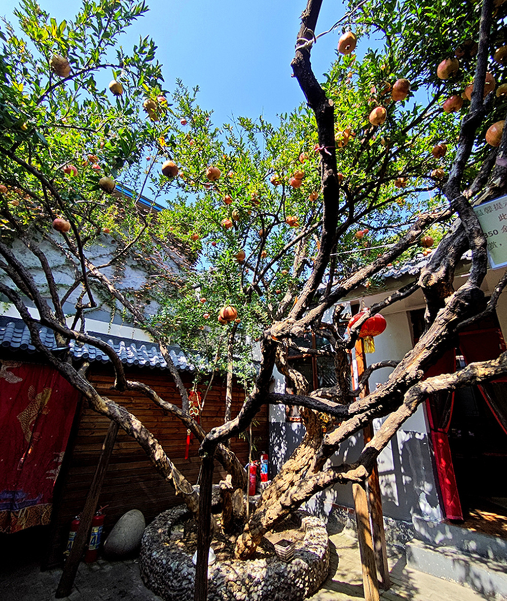 可喜的是,后院那棵老石榴树今年幸遇“大年”,硕果累累,挂满枝头。有些来此就餐的人很想亲手采摘并买些石榴带回去,但都会被婉拒。张家有个不成文的规矩,石榴一个不摘,一个不卖,只供观瞻。就让那些石榴果静静地挂在树梢,等到来年春风沉醉,一只只喜鹊登门,石榴成为它们的美餐。