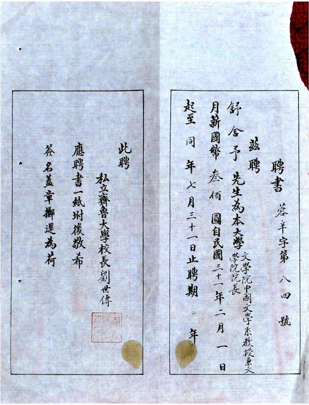 齐鲁大学校长刘世传签发的聘请老舍为齐大文学院院长的聘书