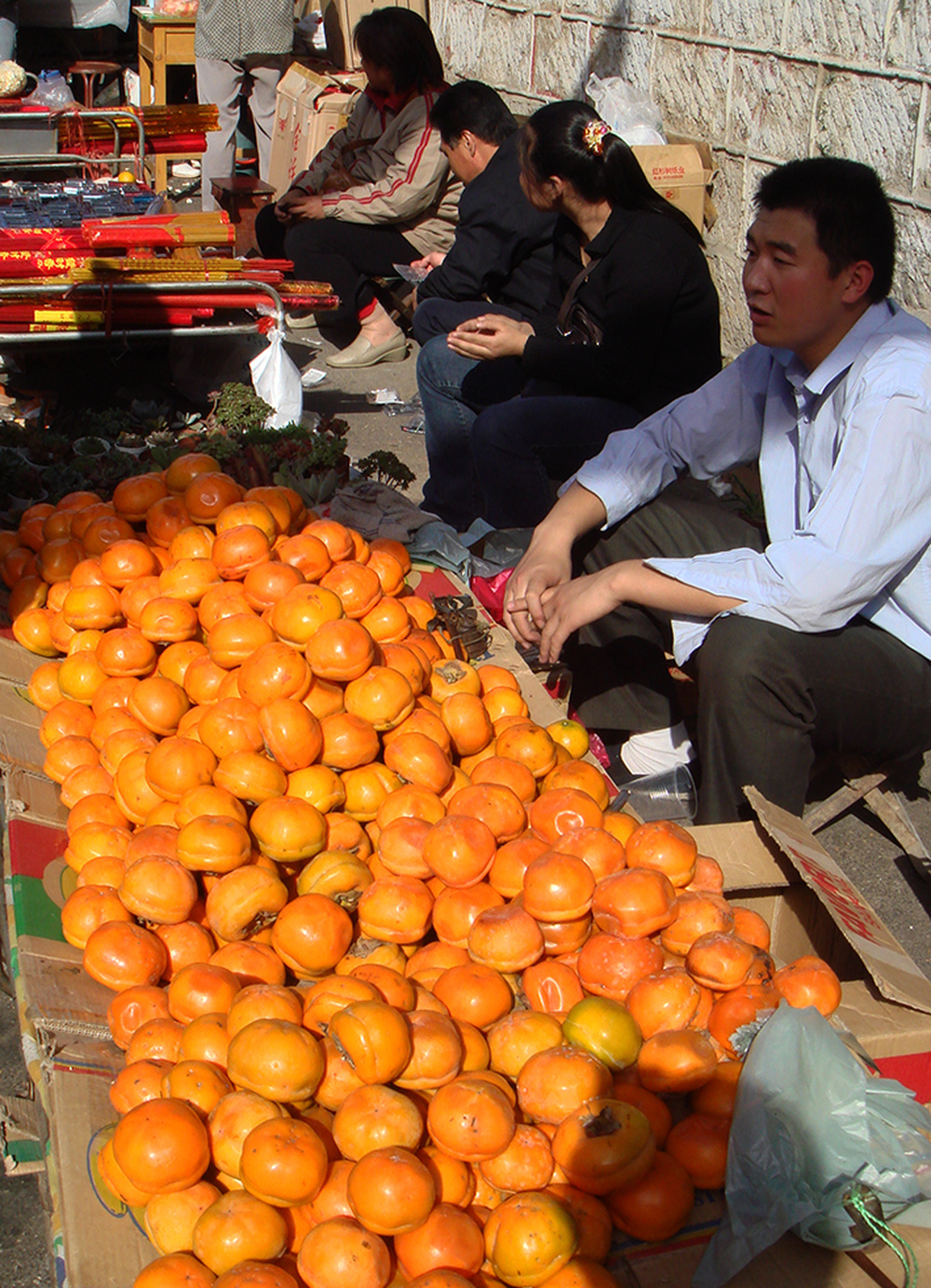 他朴实而绘声绘色的话语道出那时庙会的大致内容。他所说的“最有主顾”的柿子也恰恰是庙会的一大亮点。济南南山盛产柿子、核桃、栗子、山楂、红枣、梨、桃和石榴。每至重阳时节,山民们便不约而同赶着牛车、马车或驴车,或拉着地排车,或手提肩挑,将各色山果集中搬运到千佛山上,沿着登山盘道铺展开来,摆摊设点,尤其是一个个橙红色的柿子摊,无疑成为庙会的主角儿。其中有济南人称之为“大盒柿”的脆柿子,也有被叫作“喝蜜的”绵软的小柿子,还有裹着一层白色糖霜的柿饼,无论哪种,都是那样甜美,那样沁人心脾。正是因为柿子交易红红火火,这庙会也曾经有过“柿子会”的别称。