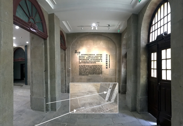 在筹建胶济铁路博物馆的过程中,发现一楼西边一个房间的装修木板隔墙被拆除后,露出了隐藏在里面的红砖墙拱,也是该建筑后期改造留下的痕迹。