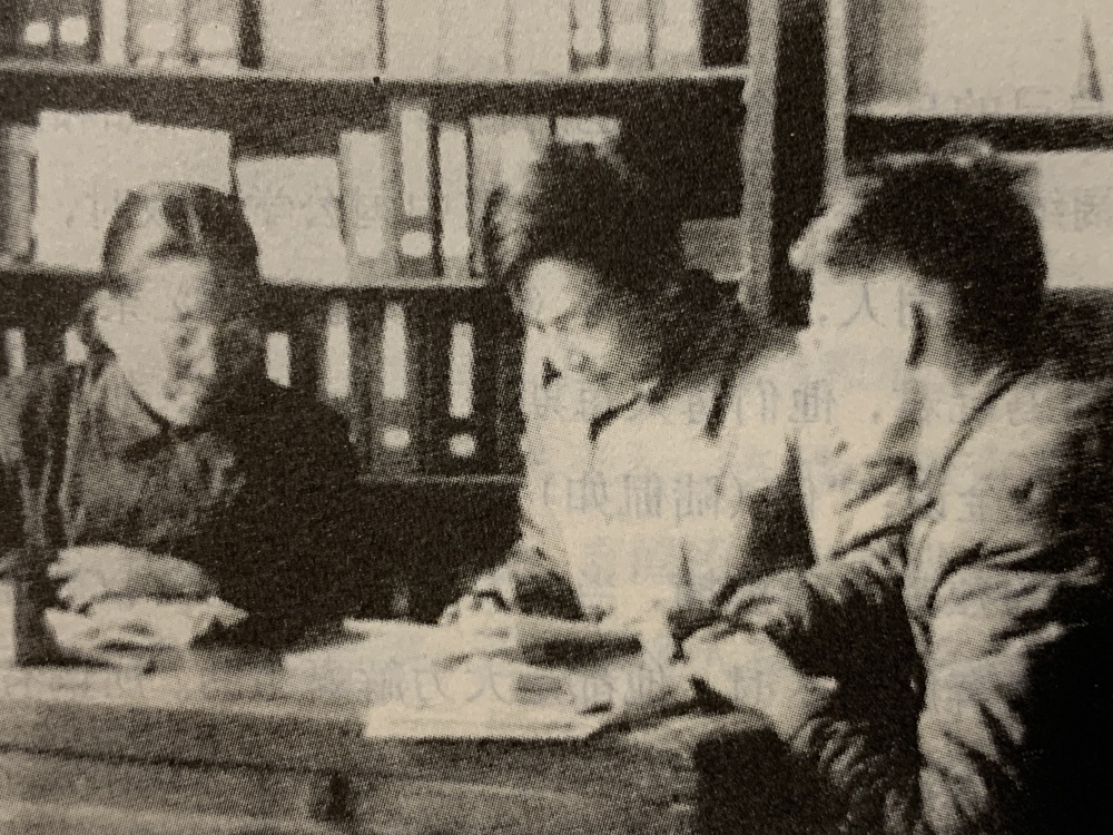 冯沅君(左一)和山东大学教授关德栋(中)在检查助教袁世硕进修情况