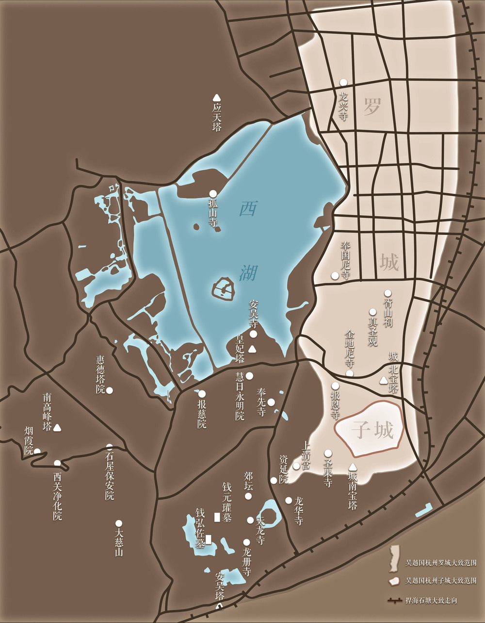 北宋杭州,甚至南宋都城临安府,也基本沿用了钱镠修筑的杭州罗城。南宋《咸淳临安志》中记载的南宋临安府罗城墙与吴越国时期几乎一样。元末,张士诚将杭州罗城南城墙北移至万松岭,东城墙东移至贴沙河,明清沿用不变。可以说,钱镠修筑的杭州罗城,奠定了后世1000年杭州城市的基本格局,是今天杭州城的母本。从这点说,钱镠称得上是真正的杭州城之父。