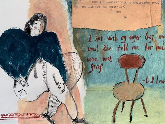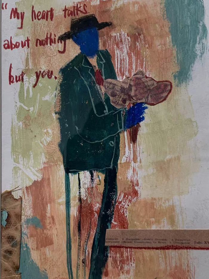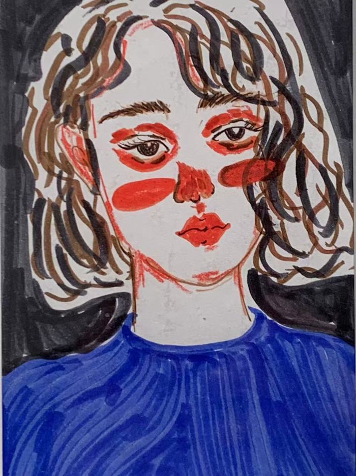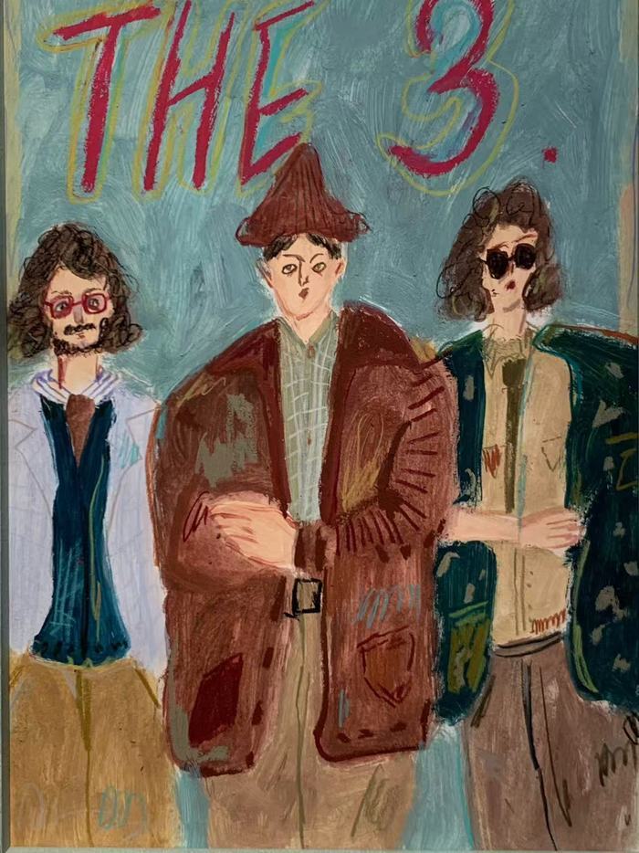 或许是因为没受过专业训练,潘宁总是觉得绘画需要像美术系的学生那样从素描、光影的训练开始,但日本插画师长场熊的画让她意识到,其实画画“也可以从简单的勾线开始”,于是她就开始在网上学“板绘课”,“是在iPad上画,虽然能用很多不一样的笔触来画,也能反复修改,但也导致我总是不停地修改。”于是她又报了“手绘课”,水粉、水彩、油画,慢慢画,“有一年多时间总是在磨人物造型”,“不想太写实,我画画是为了调剂生活,为了让自己变得更快乐一些。所以不能没有色彩。也喜欢尝试新的画法,甚至用各种各样的材料进行拼贴。”