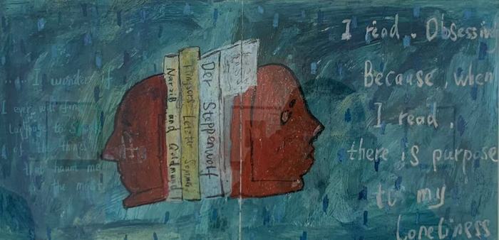 由此,潘宁的画仿佛一份“时光手札”——“用日记体的绘画方式,安放自我,打开世界”。潘宁喜欢在画上加一些文字,“但不是汉字,那样就太直白了”。其中一幅《Reading》,画面上一个小书架,左右两张侧脸,中间夹着的几本书,是她钟爱的德国作家黑塞的书,书脊上的书名,潘宁用了德文。画完后觉得画面有点空,就又加了两句英文,其中一句的大意是——“我之所以痴迷阅读,因为它能抚慰我的孤独”。