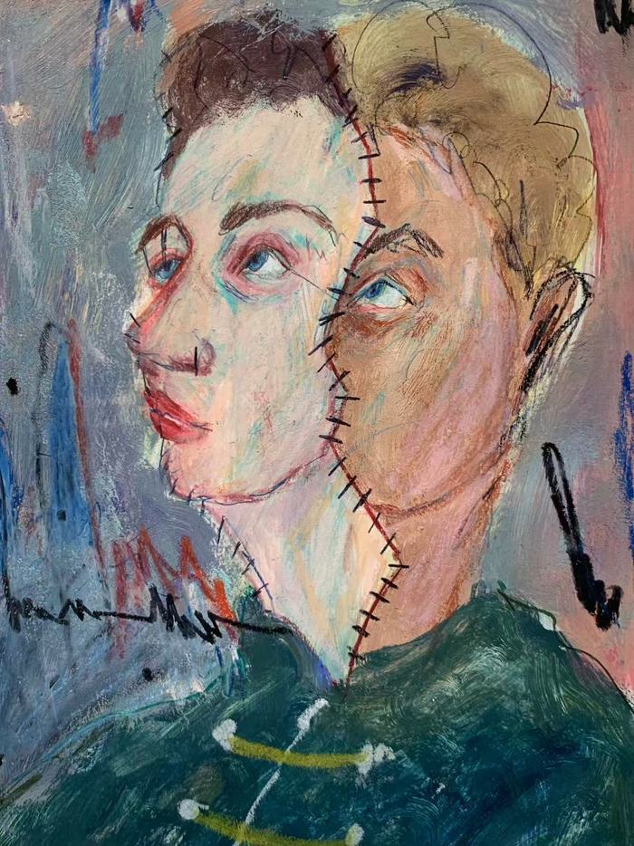 有时候一幅画的诞生,甚至只是因为一句话。比如一幅两张脸长在一个头上的画,就是因为潘宁记得英国诗人柯勒律治说的那句话:“伟大的灵魂都是雌雄同体的。”而潘宁又特别喜欢伍尔夫,喜欢她的《奥兰多》,在《奥兰多》中,伍尔夫描述了一位雌雄同体的角色:时男时女,做男人时英勇无畏,做女人时妩媚细腻,集两性的性格、精神于一身,独立又完美。