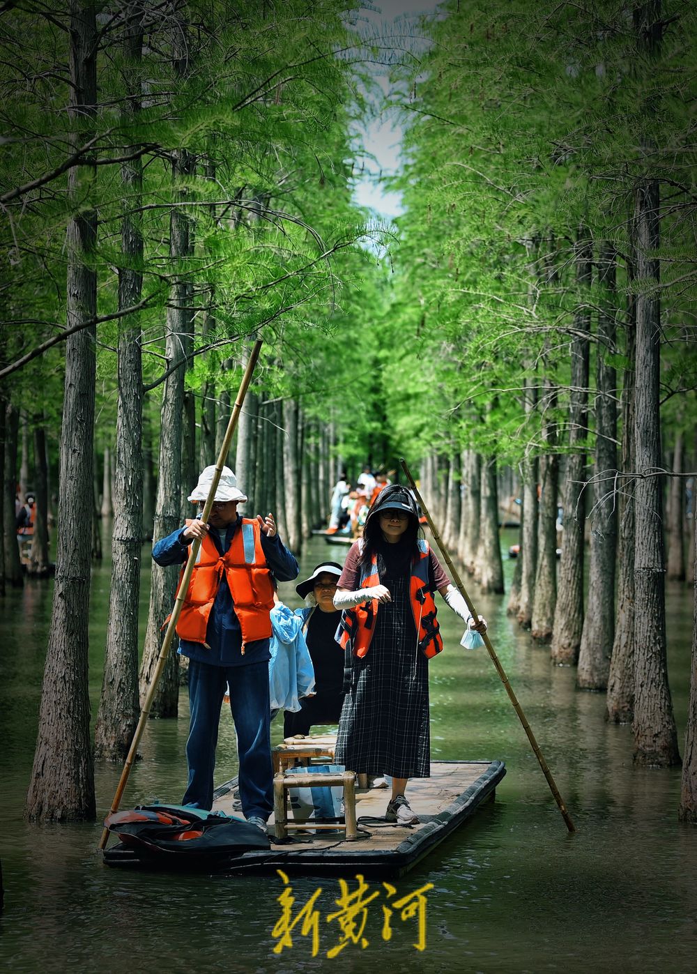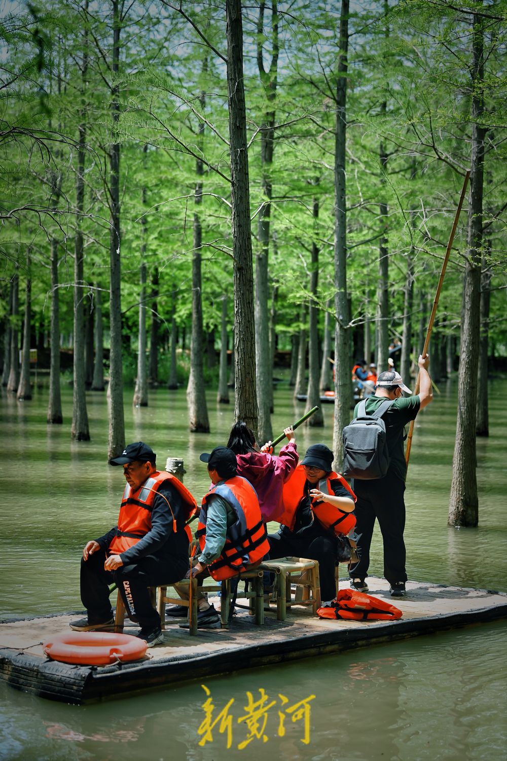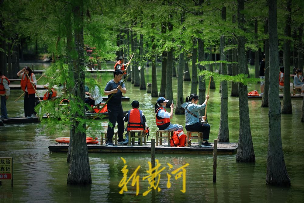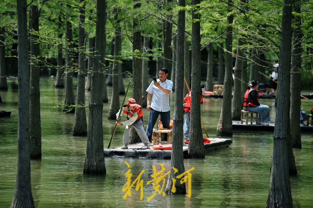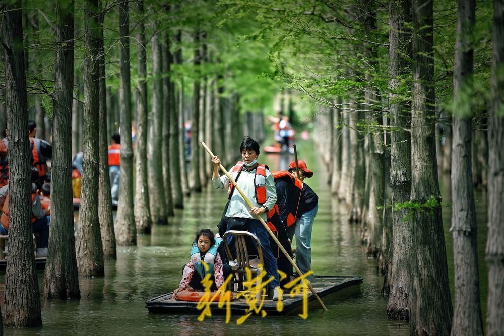 5月3日,江苏泗洪洪泽湖湿地景区千亩水杉林吐绿,五一假期,游客纷至沓来,或沿栈道徜徉杉林,或划竹筏在林中穿行,尽情感受“林在水中生,船在林间行,人在画中游”的生态意境,让人流连忘返。
