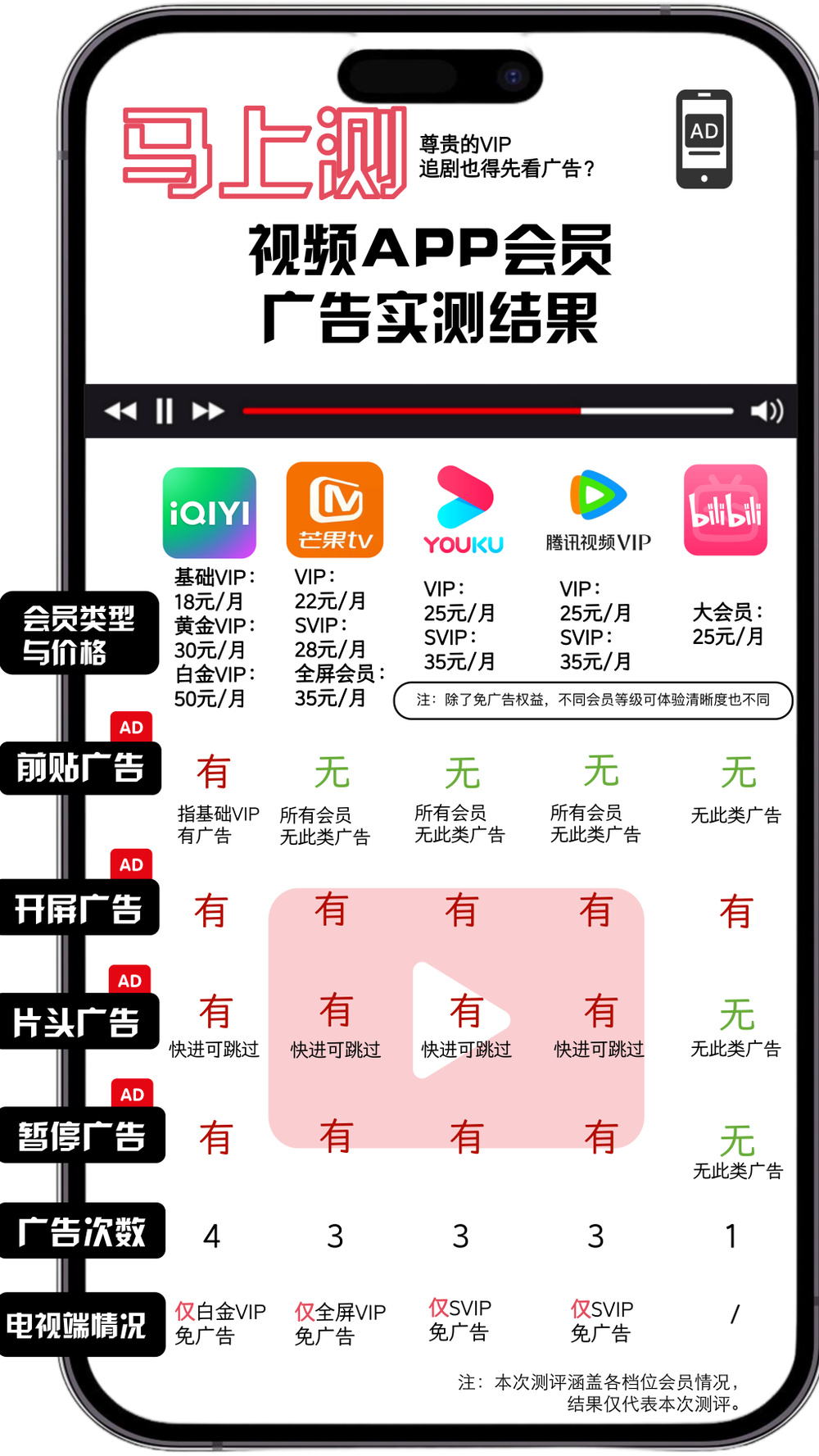 腾讯视频则说明会减免部分播放前贴片广告时长,但无法完全消除所有广告,部分内容因版权等原因,片头、片中、片尾可能出现包括贴片、开机广告在内的十余种广告,且部分无法关闭。