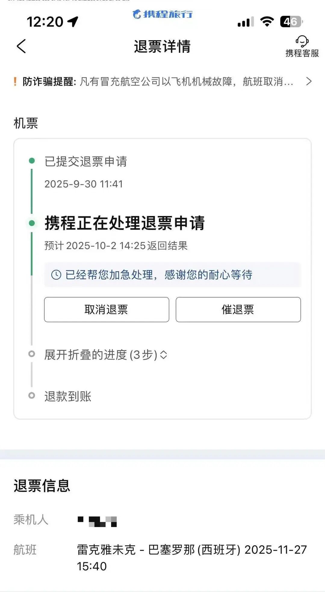 为避免耽误整个行程,吴先生不得不重新订下其他航司的机票。而重订机票,他不仅花费了更多费用,还需到米兰中转,增加了路途耗时。吴先生称,事后他多次与携程方就退费问题进行沟通,但始终无果。“所有的回复都是要跟航空公司(冰岛play航空)沟通,看那边的政策。”吴先生表示,截至目前,他的App后台仍旧显示“携程正在处理退票申请”。