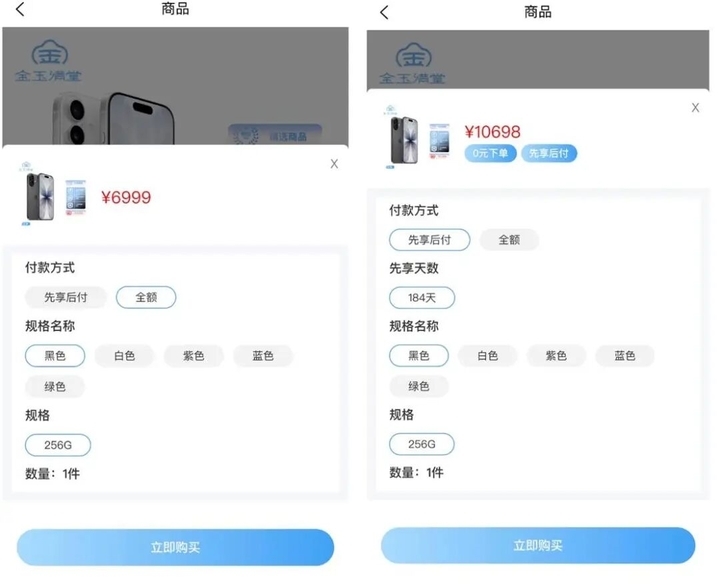 记者测试发现,在金玉满堂上购物可选择全额支付或者先享后付。全额支付的商品价格更低;先享后付的商品价格更高,且先享后付根据商品类别不同先享天数不同,包括30天和184天等。
