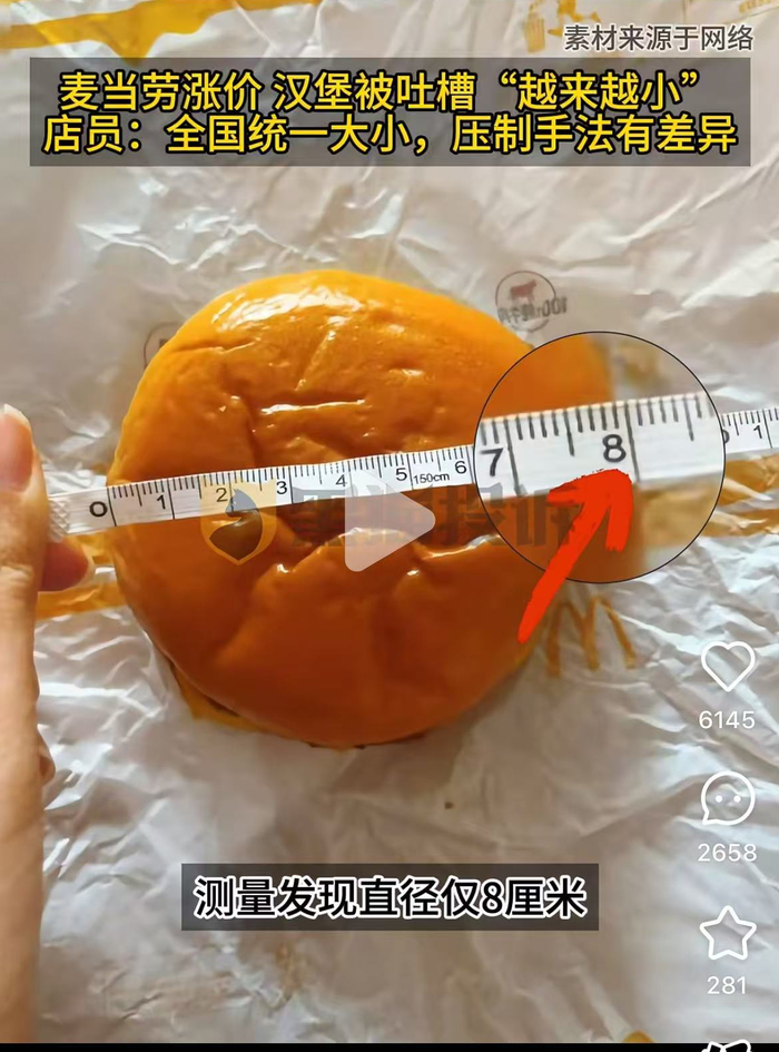 “一口咬下去,感觉吃掉了三分之一”“汉堡小到可以叫‘迷你堡’了”“麦当劳汉堡尺寸越来越小,怀疑麦当劳有自己的度量衡”……近一个月来,在微博、小红书、抖音等社交平台上,关于麦当劳汉堡尺寸变小的讨论不断升温。
